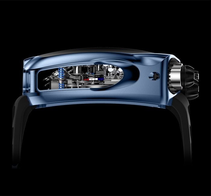 Часы Jacob & Co. Bugatti Chiron Tourbillon представлены в корпусе из титана размером 55 x 44 x 20 мм и водонепроницаемостью до 30 метров. Внутри корпуса установлен механизм с ручным заводом, Калибр JCAM37 с запасом хода 60 часов. На серебристом скелетированном циферблате отображаются часы, минуты, секунды, запас хода, турбийон. Часы комплектуются каучуковым ремешком с вставкой из титана. Серия ограничена - 50 шт.