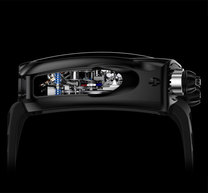 Часы Jacob & Co. Bugatti Chiron Tourbillon представлены в корпусе из титана с покрытием DLC размером 55 x 44 x 20 мм и водонепроницаемостью до 30 метров. Внутри корпуса установлен механизм с ручным заводом, Калибр JCAM37 с запасом хода 60 часов. На серебристом скелетированном циферблате отображаются часы, минуты, секунды, запас хода, турбийон. Часы комплектуются каучуковым ремешком с вставкой из титана. Серия ограничена - 126 шт.