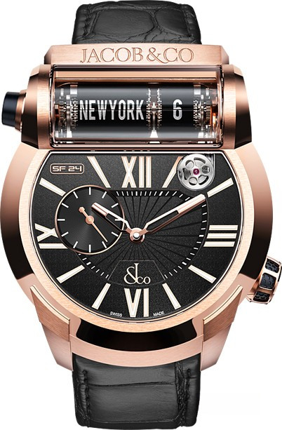 Часы Jacob & Co. Grand Complication Masterpieces Epic SF24 представлены в корпусе из розового золота 18к размером 45 х 16.7 х 13.65 мм и водонепроницаемостью 30 метров. Внутри корпуса установлен автоматический механизм, Калибр JCAA02, обладающий запасом хода 48 часов. На черном циферблате отображаются часы, минуты, секунды, время второго часового пояса. Модель комплектуется ремешком из кожи аллигатора с вставкой из розового золота 18к. Часы выпущены ограниченной серией 101 шт.