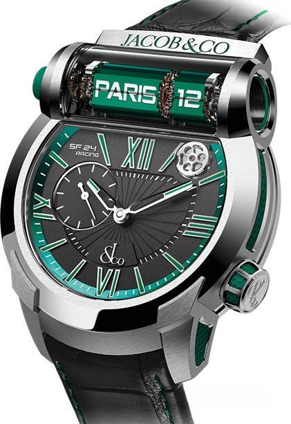 Часы Jacob & Co. Grand Complication Masterpieces Epic SF24 Racing представлены в корпусе из титана размером 45 х 16.7 х 13.65 мм и водонепроницаемостью 30 метров. Внутри корпуса установлен автоматический механизм, Калибр JCAA02, обладающий запасом хода 48 часов. На черном циферблате отображаются часы, минуты, секунды, время второго часового пояса. Модель комплектуется ремешком из кожи аллигатора с титановой вставкой. Часы выпущены ограниченной серией 101 шт.