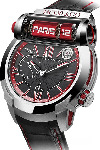 Часы Jacob & Co. Grand Complication Masterpieces Epic SF24 Racing представлены в корпусе из титана размером 45 х 16.7 х 13.65 мм и водонепроницаемостью 30 метров. Внутри корпуса установлен автоматический механизм, Калибр JCAA02, обладающий запасом хода 48 часов. На черном циферблате отображаются часы, минуты, секунды, время второго часового пояса. Модель комплектуется ремешком из кожи аллигатора с титановой вставкой. Часы выпущены ограниченной серией 101 шт.