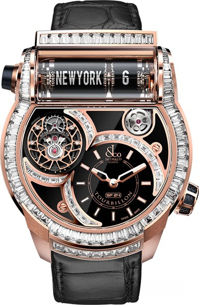 Часы Jacob & Co. Grand Complication Masterpieces Epic SF24 Tourbillon представлены в корпусе из розового золота 18к размером 45 х 16.7 х 13.65 мм и водонепроницаемостью 30 метров. Внутри корпуса установлен автоматический механизм, Калибр JCAA03, обладающий запасом хода 48 часов. На черном циферблате с белыми багетными бриллиантами отображаются часы, минуты, клеть турбийона. Модель комплектуется ремешком из кожи аллигатора с вставкой из розового золота 18к. Корпус инкрустирован белыми багетными бриллиантами. Часы выпущены ограниченной серией 101 шт.