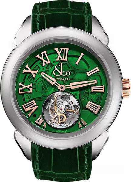 Часы Jacob & Co. Grand Complication Masterpieces Palatial Flying Tourbillon Hours Minutes представлены в корпусе из титана размером 43 х 12.7 мм и водонепроницаемостью 30 метров. Внутри корпуса установлен механизм с ручным заводом, Калибр JCBM01, обладающий запасом хода 100 часов. На зеленом скелетированном циферблате отображаются часы, минуты, запас хода, турбийон. Модель комплектуется ремешком из кожи аллигатора с вставкой из титана. Часы выпущены ограниченной серией 36 штук.