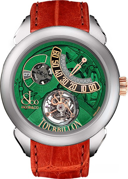 Часы Jacob & Co. Grand Complication Masterpieces Palatial Flying Tourbillon Jumping Hours представлены в корпусе из титана размером 43 х 12.7 мм и водонепроницаемостью 30 метров. Внутри корпуса установлен механизм с ручным заводом, Калибр JCBM02, обладающий запасом хода 100 часов. На зеленом скелетированном циферблате отображаются часы, минуты, запас хода, турбийон. Модель комплектуется ремешком из кожи аллигатора с вставкой из титана. Часы выпущены ограниченной серией 36 штук.