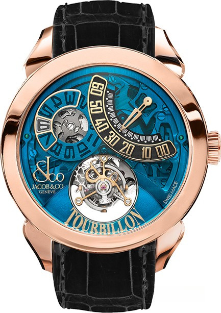 Часы Jacob & Co. Grand Complication Masterpieces Palatial Flying Tourbillon Jumping Hours представлены в корпусе из розового золота 18к размером 43 х 12.7 мм и водонепроницаемостью 30 метров. Внутри корпуса установлен механизм с ручным заводом, Калибр JCBM02, обладающий запасом хода 100 часов. На синем скелетированном циферблате отображаются часы, минуты, запас хода, турбийон. Модель комплектуется ремешком из кожи аллигатора с вставкой из розового золота 18к. Часы выпущены ограниченной серией 12 штук.