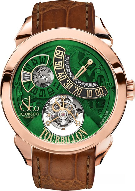 Часы Jacob & Co. Grand Complication Masterpieces Palatial Flying Tourbillon Jumping Hours представлены в корпусе из розового золота 18к размером 43 х 12.7 мм и водонепроницаемостью 30 метров. Внутри корпуса установлен механизм с ручным заводом, Калибр JCBM02, обладающий запасом хода 100 часов. На зеленом скелетированном циферблате отображаются часы, минуты, запас хода, турбийон. Модель комплектуется ремешком из кожи аллигатора с вставкой из розового золота 18к. Часы выпущены ограниченной серией 12 штук.