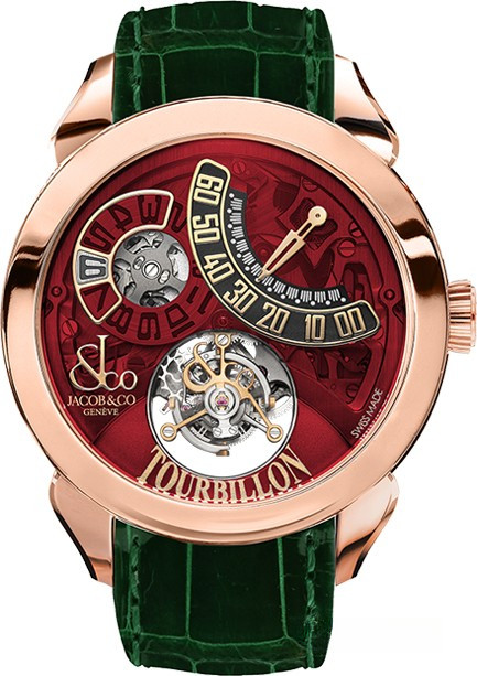 Часы Jacob & Co. Grand Complication Masterpieces Palatial Flying Tourbillon Jumping Hours представлены в корпусе из розового золота 18к размером 43 х 12.7 мм и водонепроницаемостью 30 метров. Внутри корпуса установлен механизм с ручным заводом, Калибр JCBM02, обладающий запасом хода 100 часов. На красном скелетированном циферблате отображаются часы, минуты, запас хода, турбийон. Модель комплектуется ремешком из кожи аллигатора с вставкой из розового золота 18к. Часы выпущены ограниченной серией 12 штук.