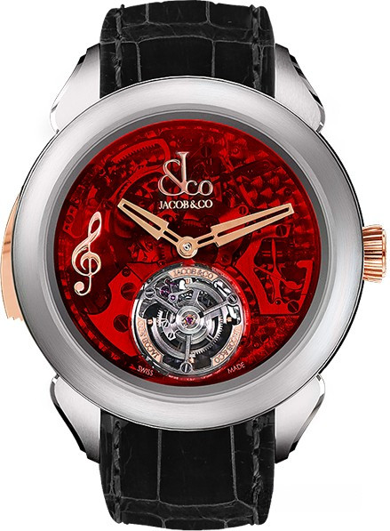Часы Jacob & Co. Grand Complication Masterpieces Palatial Flying Tourbillon Minute Repeater представлены в корпусе из титана размером 43 х 12.3 мм и водонепроницаемостью 30 метров. Внутри корпуса установлен механизм с ручным заводом, Калибр JCBM03, обладающий запасом хода 90 часов. На красном циферблате отображаются часы, минуты, турбийон. Кнопка репетира расположена на боковой стороне корпуса. Модель комплектуется ремешком из кожи аллигатора с вставкой из титана. Часы выпущены ограниченной серией 18 штук.