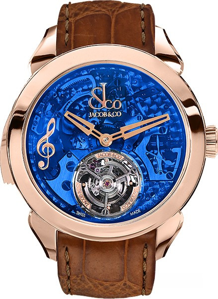 Часы Jacob & Co. Grand Complication Masterpieces Palatial Flying Tourbillon Minute Repeater представлены в корпусе из розового золота 18к размером 43 х 12.3 мм и водонепроницаемостью 30 метров. Внутри корпуса установлен механизм с ручным заводом, Калибр JCBM03, обладающий запасом хода 90 часов. На синем циферблате отображаются часы, минуты, турбийон. Кнопка репетира расположена на боковой стороне корпуса. Модель комплектуется ремешком из кожи аллигатора с вставкой из розового золота 18к. Часы выпущены ограниченной серией 12 штук.