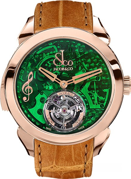 Часы Jacob & Co. Grand Complication Masterpieces Palatial Flying Tourbillon Minute Repeater представлены в корпусе из розового золота 18к размером 43 х 12.3 мм и водонепроницаемостью 30 метров. Внутри корпуса установлен механизм с ручным заводом, Калибр JCBM03, обладающий запасом хода 90 часов. На зеленом циферблате отображаются часы, минуты, турбийон. Кнопка репетира расположена на боковой стороне корпуса. Модель комплектуется ремешком из кожи аллигатора с вставкой из розового золота 18к. Часы выпущены ограниченной серией 12 штук.