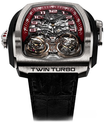 Часы Jacob & Co. Grand Complication Masterpieces Twin Turbo представлены в корпусе из титана размером 57.3 х 51 х 16.9 мм и водонепроницаемостью 30 метров. Внутри корпуса установлен механизм с ручным заводом, Калибр JCFM01, обладающий запасом хода 72 часа. На серебристом скелетированном циферблате отображаются часы, минуты, турбийон. Модель комплектуется ремешком из кожи аллигатора с титановой вставкой. Часы выпущены ограниченной серией 18 штук.
