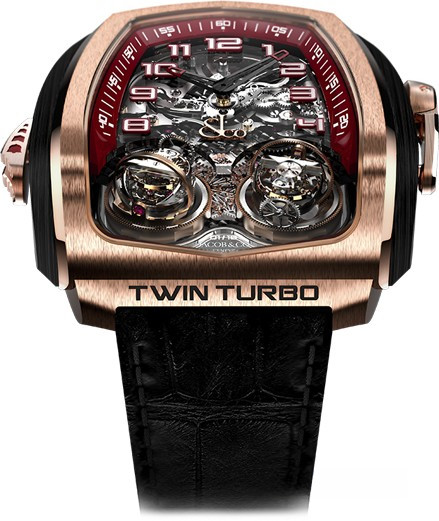 Часы Jacob & Co. Grand Complication Masterpieces Twin Turbo представлены в корпусе из розового золота 18к и карбона размером 57.3 х 51 х 16.9 мм и водонепроницаемостью 30 метров. Внутри корпуса установлен механизм с ручным заводом, Калибр JCFM01, обладающий запасом хода 72 часа. На серебристом скелетированном циферблате отображаются часы, минуты, турбийон. Модель комплектуется ремешком из кожи аллигатора с вставкой из розового золота 18к. Часы выпущены ограниченной серией 18 штук.