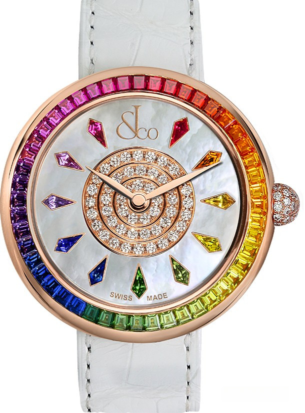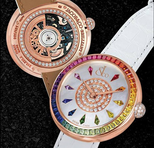 Название часам от компании Jacob & Co дали 49 ярких сапфиров всех цветов радуги, общим весом 18 карат, которыми инкрустирован безель. Корпус диаметром 42 миллиметра выполнен из розового золота 18к. На защищенном прочным сапфировым стеклом перламутровом циферблате расположились золотые центральные стрелки и часовые индексы, представленные сапфирами трапециевидной огранки. Особый эффект достигается за счет того, что цвет использованных камней в точности соответствует цвету сапфиров, расположенных в соответствующем секторе безеля. В самом центре циферблата находятся три ряда круглых белых бриллиантов. В районе двенадцатичасовой отметки поместился логотип компании Jacob & Co. На задней крышке хронометра присутствует прочное сапфировое стекло, позволяющее наблюдать за работой швейцарского механизма с автоматическим подзаводом. Стекло окружено цепочкой белых бриллиантов. В комплекте с часами поставляется белый ремешок из кожи аллигатора.