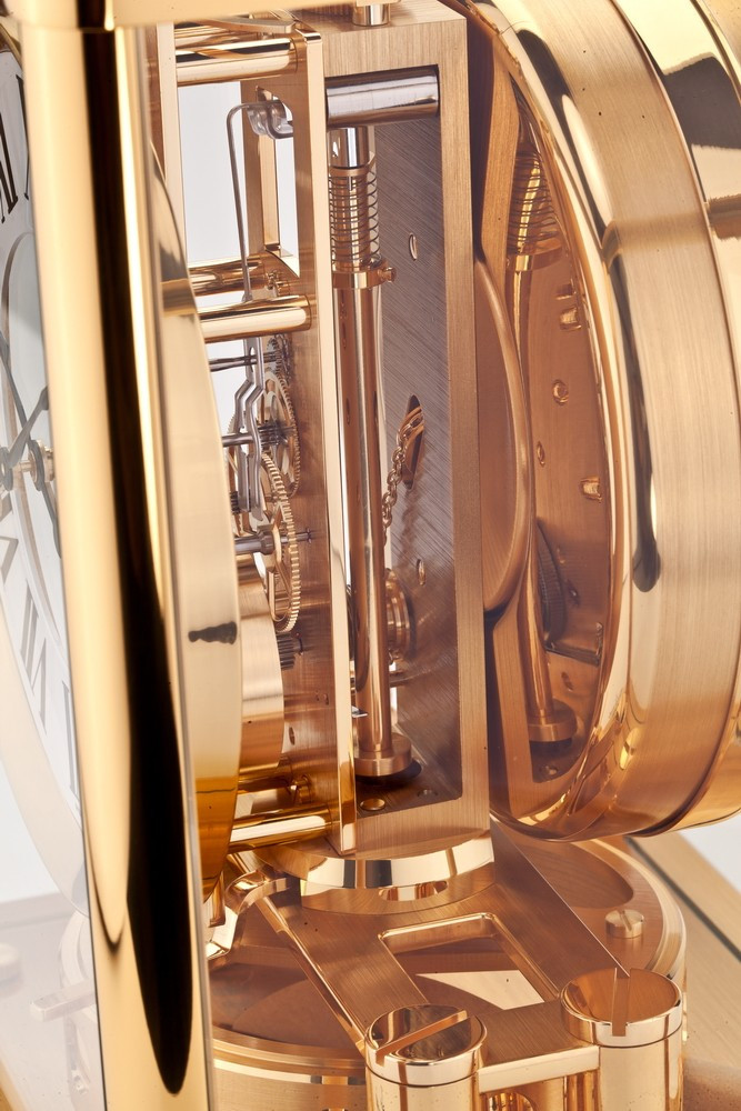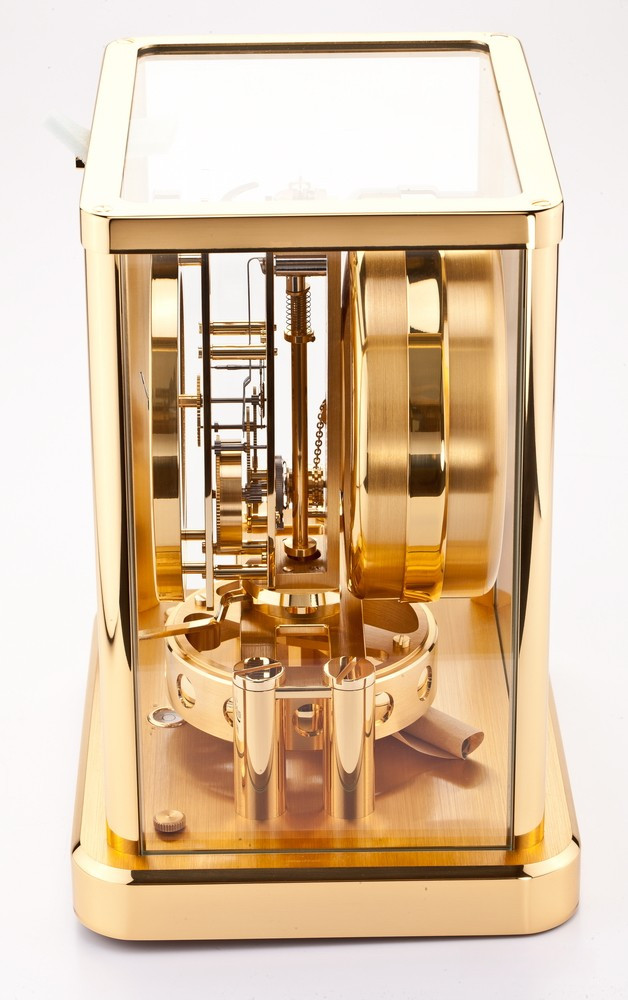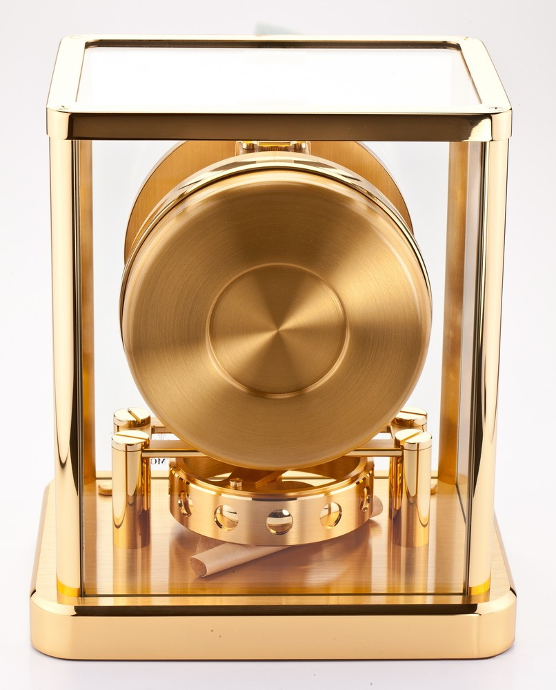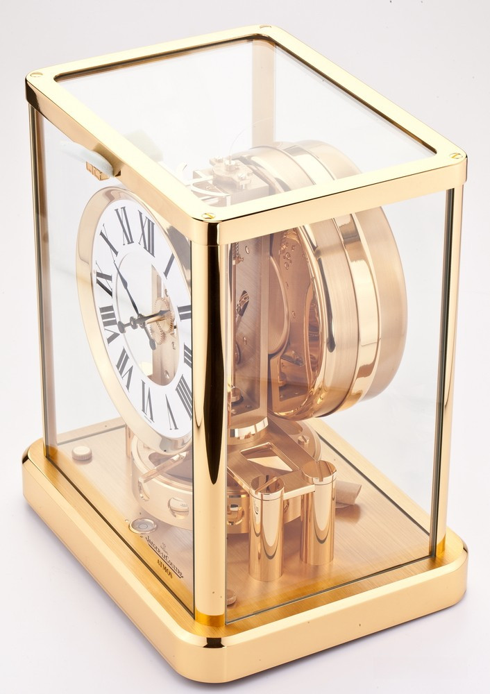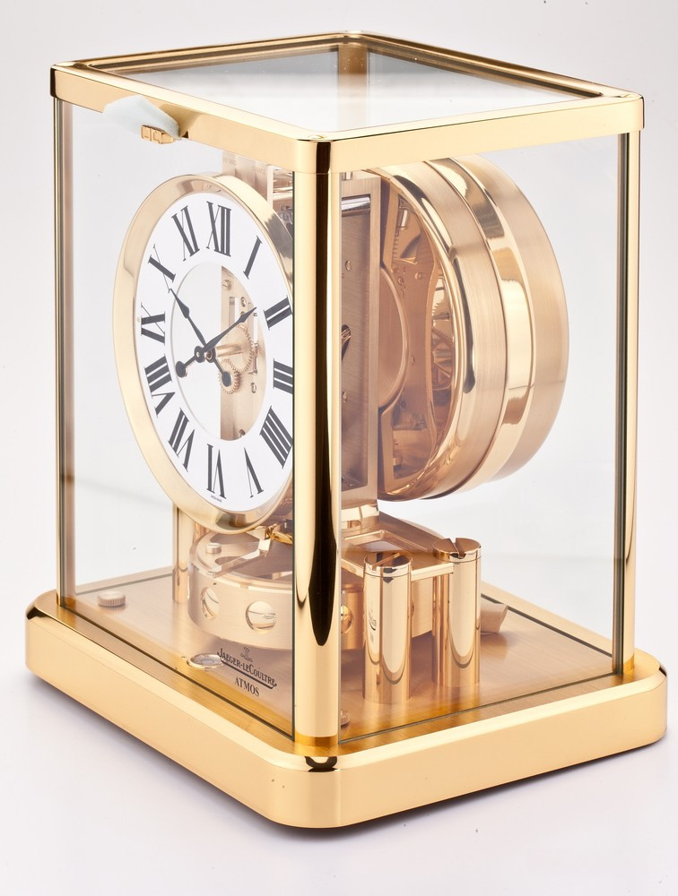 Настольные часы Jaeger-LeCoultre Atmos Classique 5101202 выполнены из позолоченной латуни, размером 200 мм x 155 мм x 225 мм. Циферблат у часов белый с золотистым. Механизм Jaeger-LeCoultre 560 собран из 207 деталей. Прозрачный корпус открывает все тайны гениального механизма. Принцип работы часов состоит в следующем: объем газа, помещенного в герметичную камеру, увеличивается и уменьшается в зависимости от изменения температуры воздуха. Стенки капсулы, имеющие форму гармошки, перемещаются и заводят ходовую пружину часов. В пределах между 15 и 30 градусами Цельсия достаточно колебания температуры на один градус, чтобы обеспечить часам запас хода приблизительно на два дня. Часы Atmos сконструированы так, чтобы энергии завода оказывалось минимально возможное сопротивление. Все компоненты настольных часов Atmos обладают невероятной точностью и надежностью, кроме того, они работают практически без износа. Таким образом, часы отличаются долговечностью, которая теоретически достигает 600 лет.