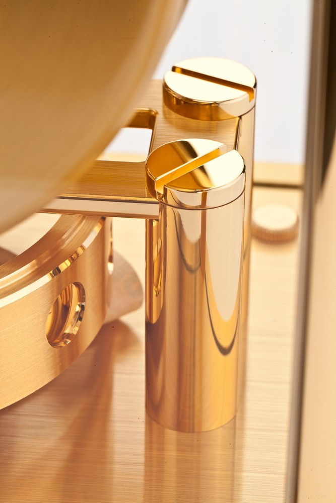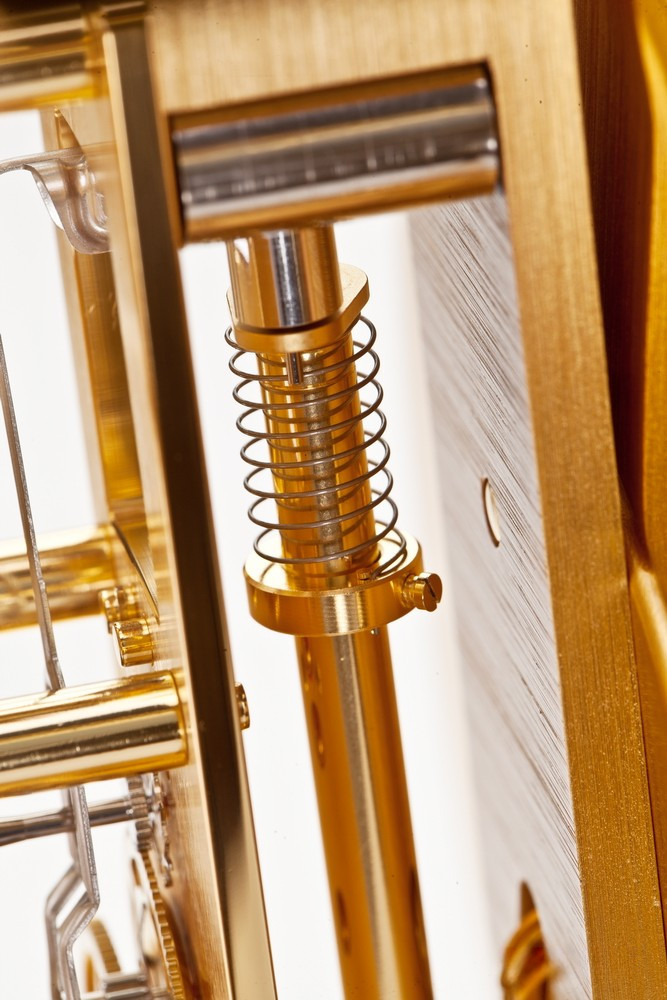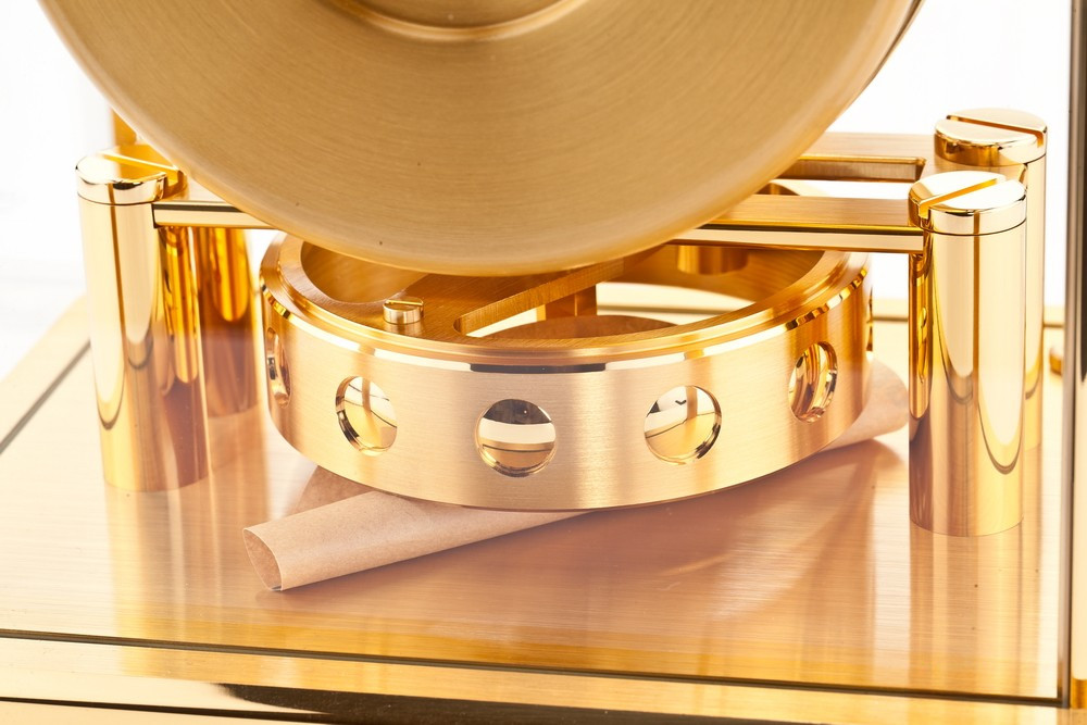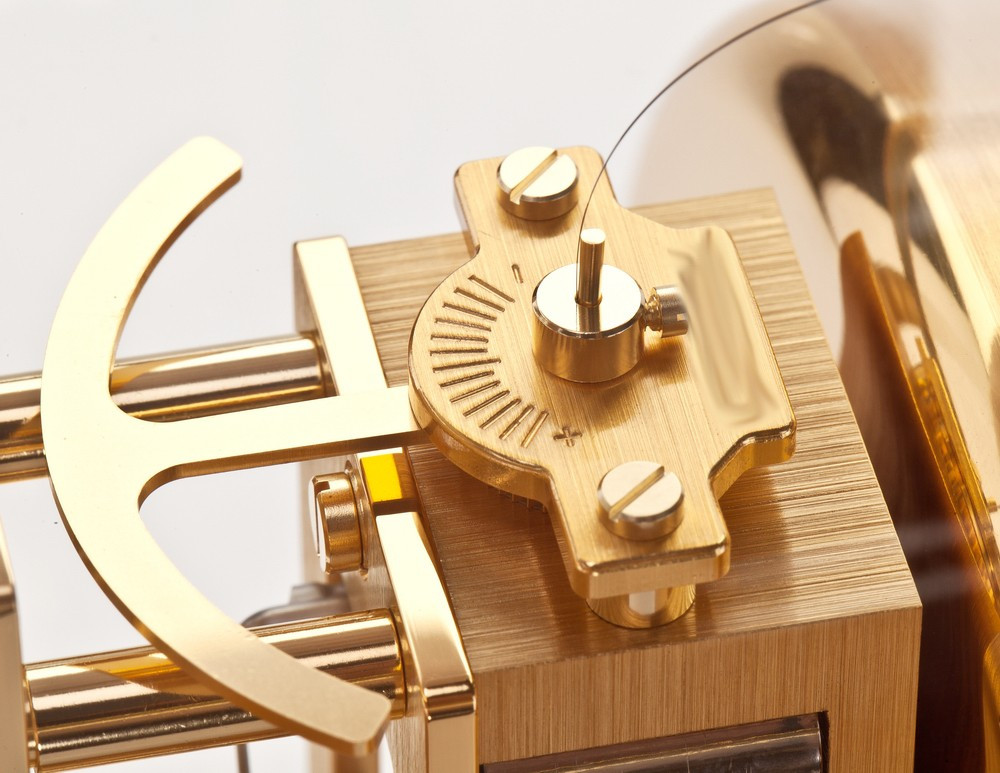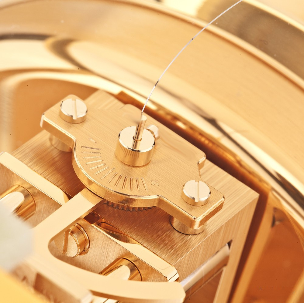 Настольные часы Jaeger-LeCoultre Atmos Classique 5101202 выполнены из позолоченной латуни, размером 200 мм x 155 мм x 225 мм. Циферблат у часов белый с золотистым. Механизм Jaeger-LeCoultre 560 собран из 207 деталей. Прозрачный корпус открывает все тайны гениального механизма. Принцип работы часов состоит в следующем: объем газа, помещенного в герметичную камеру, увеличивается и уменьшается в зависимости от изменения температуры воздуха. Стенки капсулы, имеющие форму гармошки, перемещаются и заводят ходовую пружину часов. В пределах между 15 и 30 градусами Цельсия достаточно колебания температуры на один градус, чтобы обеспечить часам запас хода приблизительно на два дня. Часы Atmos сконструированы так, чтобы энергии завода оказывалось минимально возможное сопротивление. Все компоненты настольных часов Atmos обладают невероятной точностью и надежностью, кроме того, они работают практически без износа. Таким образом, часы отличаются долговечностью, которая теоретически достигает 600 лет.