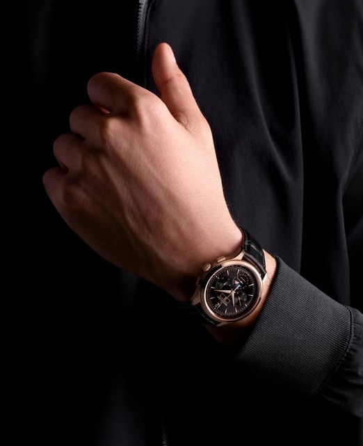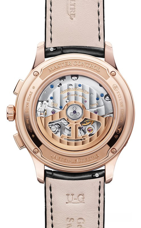 Часы Jaeger-LeCoultre Master Control Chronograph Calendar представлены в корпусе из розового золота 18к размером 40 х 12.05 мм водонепроницаемостью 50 метров. Внутри корпуса находится автоматический механизм, Калибр Jaeger-LeCoultre 759, обладающий запасом хода 65 часов. На черном циферблате отображаются часы, минуты, секунды, дата, день недели, неделя, месяц, фаза луны. Часы поставляются на ремешке из кожи аллигатора с золотой застежкой.