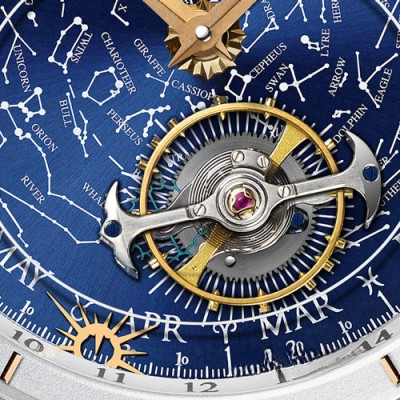 Часы Master Grande Tradition Grande Complication из розового золота – это настоящий микромир на запястье. Орбитальный турбийон и зодиакальный календарь этой модели увлекают нас в другое измерение. Настоящая находка для любителей редких шедевров. Корпус размером 44 х 15.8 мм изготовлен из розового золота 18к, водонепроницаемость 50 метров. Внутри установлен механизм с ручным заводом, Калибр 945. На синем циферблате отображаются часы, минуты, месяц, зодиакальный календарь, индикация официального времени по 24-часовой шкале, небесный свод. Часы комплектуются ремешком из кожи аллигатора с вставкой из розового золота 18к.