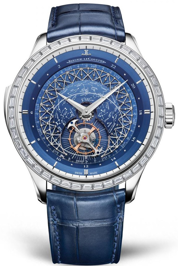 Часы Master Grande Tradition Grande Complication из белого золота – это настоящий микромир на запястье. Орбитальный турбийон и зодиакальный календарь этой модели увлекают в другое измерение. Настоящая находка для любителей редких шедевров. Корпус размером 45 мм изготовлен из белого золота 18к, водонепроницаемость 50 метров. Внутри установлен механизм с ручным заводом, Калибр 945. На синем циферблате отображаются часы, минуты, месяц, зодиакальный календарь, индикация официального времени по 24-часовой шкале, небесный свод. Часы комплектуются ремешком из кожи аллигатора с вставкой из белого золота 18к. Безель из белых багетных бриллиантов. Серия ограничена - 8 шт.