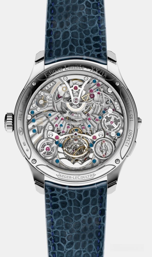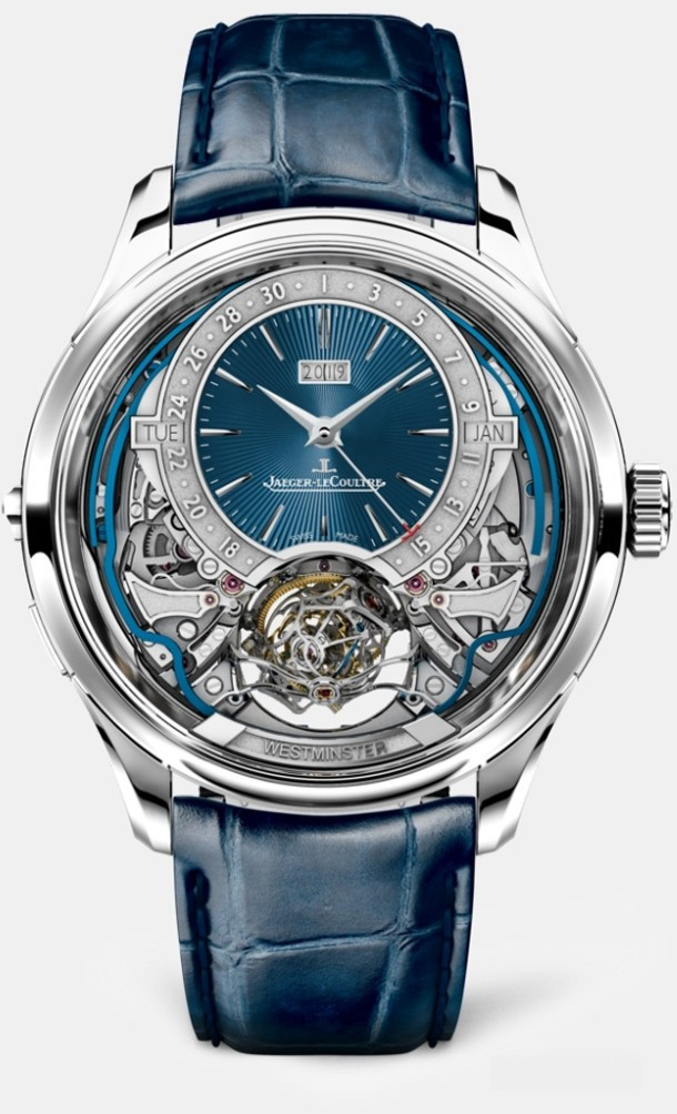 Подобно всем предыдущим моделям коллекции Hybris Mechanica, часы Master Grande Tradition Gyrotourbillon Westminster Perpetual с синим, покрытым эмалью и украшенным гильоше циферблатом воплощают самую суть высокого часового искусства в каждой своей детали, вплоть до артикула изделия. Этот образец точности и эксклюзивности, выпущенный ограниченной серией из 18 изделий, содержит в себе три самых культовых усложнения, а именно: сферический парящий турбийон Gyrotourbillon®, минутный репетир с перезвоном Westminster, воспроизводящим четыре мелодии, и вечный календарь, который саморегулируется в обоих направлениях. Впервые в истории Jaeger-LeCoultre.