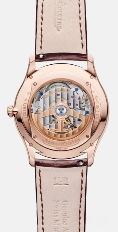 Часы Jaeger-LeCoultre Master Control Master Grand Ultra Thin обладают круглым корпусом из розового золота 18к, размеры которого составляют 39 х 8.1 мм, водонепроницаемостью до 50 м. На торце рифленой заводной головки, расположенной на 3 часах, имеется логотип в виде больших букв JL. Сапфировое стекло установлено на передней стороне часового корпуса (с антибликовым покрытием). Циферблат бежевого цвета. Модель оснащена мануфактурным швейцарским автоматическим механизмом. Калибр JLC 896/1 с 43-часовым запасом хода, функциями индикации часов, минут (посредством соответствующих центральных стрелок) и секунд (на 6-ти часах). Калибр отменно отделан и декорирован. Поставляется на ремешке из кожи аллигатора с вставкой из розового золота 18к.