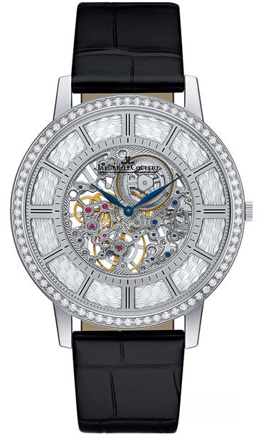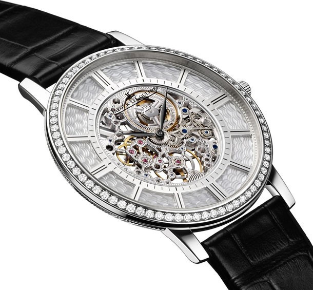 Master Ultra Thin Squelette – самая тонкая из механических моделей в мире. Бренд побил рекорд Piaget с толщиной корпуса 3,65 мм – толщина новинки всего 3,6 мм! Стоит отметить, что параметры нисколько не повлияли на внешний вид часов. Аксессуар имеет скелетонизированный циферблат, украшенный 19 драгоценными камнями. Механическая модель работает на базе калибра Jaeger-LeCoultre Calibre 849ASQ, включающего 119 компонентов и обеспечивающего 33-часовой запас хода. Аксессуар поставляется с корпусом из 18-каратного белого золота. Размер корпуса 38 х 4,7 мм для версии, инкрустированной бриллиантами. Модель дополнена ремешком из черной кожи аллигатора с золотой пряжкой.
