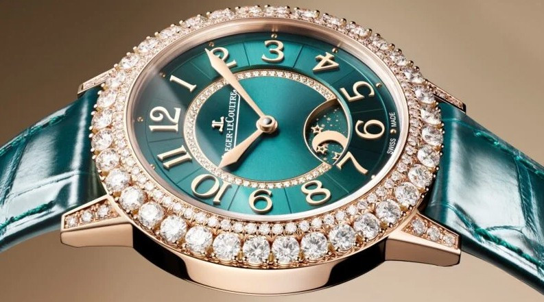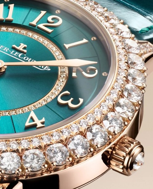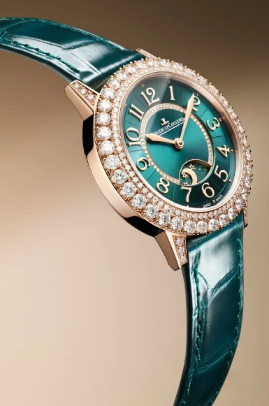 Часы Jaeger-LeCoultre Rendez-Vous Dazzling Night & Day представлены в корпусе размером 36 х 9.8 мм из розового золота 18к водонепроницаемостью 30 метров. Внутри корпуса установлен автоматический механизм, Калибр 898, обладающий запасом хода 38 часов. На зеленом циферблате с белыми бриллиантами отображаются часы, минуты, день/ночь. Часы поставляются на ремешке из кожи аллигатор с золотой застежкой. Корпус инкрустирован белыми бриллиантами.