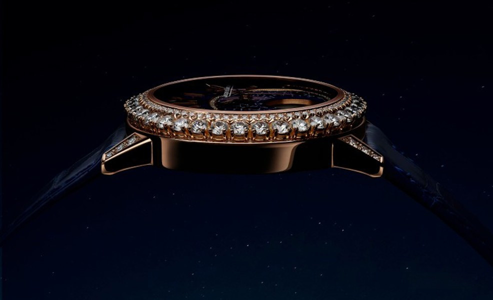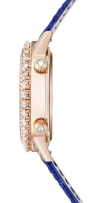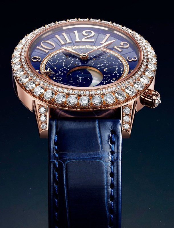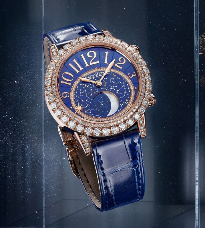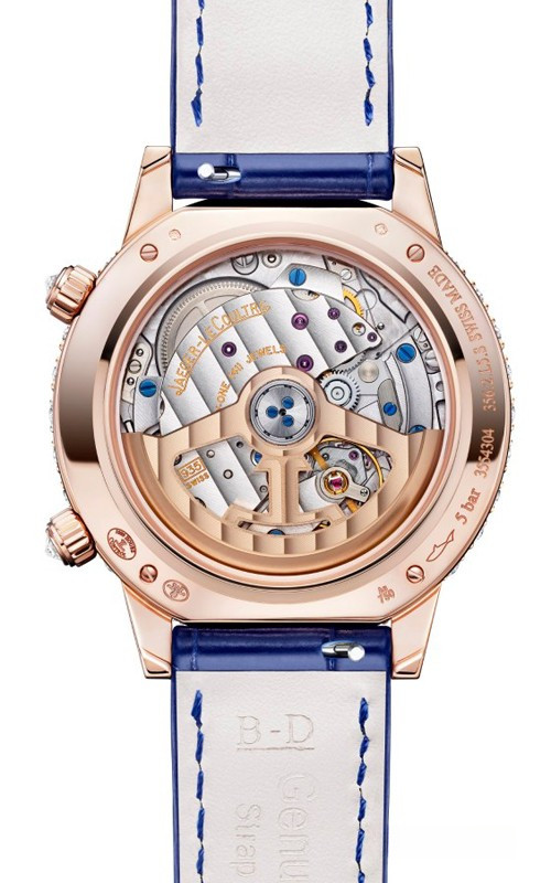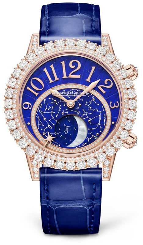 Женские часы Rendez-Vous Moon комплектуются автоматическим механизмом, Калибр JLC 935, обладающий запасом 40 хода часов. Корпус размером 36 х 10.76 мм изготовлен из розового золота 18к, водонепроницаемость до 50 метров. На синем циферблате с белыми бриллиантами отображаются часы, минуты, фаза луны. Часы комплектуются ремешком из кожи аллигатора с вставкой из розового золота 18к. Корпус инкрустирован белыми бриллиантами.