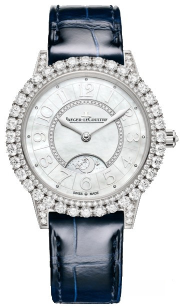 Женские часы Rendez-Vous Night & Day комплектуются автоматическим механизмом, Калибр JLC 898B/1, обладающий запасом хода 40 часов. Корпус размером 34 х 9.8 мм изготовлен из белого золота 18к, водонепроницаемость до 50 метров. На белом жемчужном циферблате отображаются часы, минуты, индикатор день/ночь. Часы комплектуются ремешком из кожи аллигатора с вставкой из белого золота 18к. Корпус инкрустирован белыми бриллиантами.