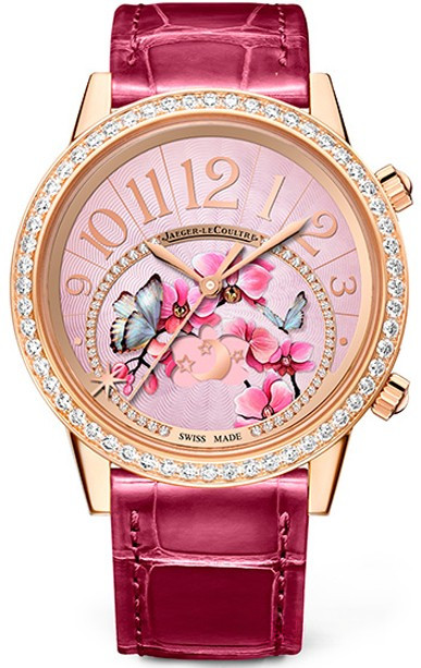 Часы Jaeger-LeCoultre Rendez-Vous Sonatina представлены в корпусе размером 38.2 х 5.57 мм из розового золота 18к водонепроницаемостью 50 метров. Циферблат украшен волнистым гильошированным мотивом, который усиливает природную красоту перламутра. На этом сияющем фоне изображена композиция из орхидей и бабочек. Маленькое овальное кольцо с бриллиантами окружает изображение. Среди цветов виден индикатор день/ночь. Все функции часов поддерживаются благодаря техническому совершенству мануфактурного Калибра 735 компании Jaeger-LeCoultre. Автоматический механизм, разработанный специально для моделей Sonatina, расположен под прозрачной задней крышкой из сапфирового стекла. Ремешок часов изготовлен из кожи аллигатора и подобран по цвету циферблата. Часы Rendez-Vous Sonatina доступны исключительно в бутиках Jaeger-LeCoultre и ограничены 8 экземплярами.