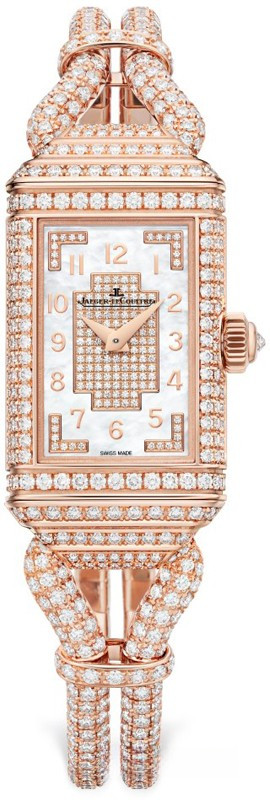 Часы Jaeger-LeCoultre Reverso One Cordonnet представлены в корпусе из розового золота 18к размером 36.3 х 18 мм и водонепроницеамостью 30 метров. Внутри корпуса установлен механизм с ручным заводом, Калибр 844, обладающий запасом хода 38 часов. На белом жемчужном циферблате с белыми бриллиантами отображаются часы и минуты. Часы комплектуются браслетом из розового золота 18к. Корпус инкрустирован белыми бриллиантами.