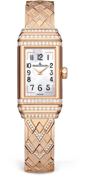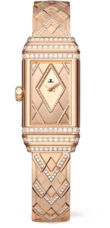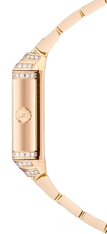 Часы представлены в корпусе из розового золота 18к размером 36.3 х 18 х 10 мм и водонепроницаемостью 30 метров. Внутри корпуса установлен механизм с ручным заводом Калибр 844. На белом жемчужном циферблате отображаются часы, минуты, на обратной стороне корпуса 'реверсо' также отображаются часы и минуты. Часы комплектуются браслетом из розового золота 18к, инкрустирвоанным елыми бриллиантами. Корпус инкрустирован белыми бриллиантами.