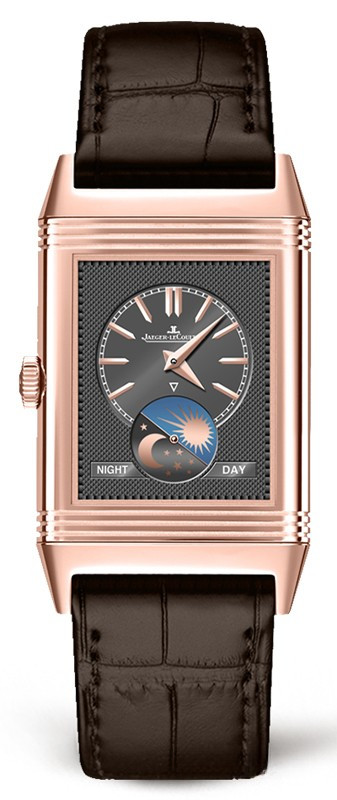 Часы представлены в корпусе из розового золота 18к размером 49.4 x 29.9 х 10.9 мм и водонепроницеамостью 30 метров. Внутри корпуса установлен механизм с ручным заводом с запасом хода 42 часа. На серебристом циферблате отображаются часы, минуты, дата, день недели, месяц, фаза луны. На обратной стороне корпуса 'реверсо' отображаются часы и минуты второго часового пояса, а также индикатор дня/ночи. Часы комплектуются коричневым ремешком из кожи аллигатора с вставкой из розового золота 18к.