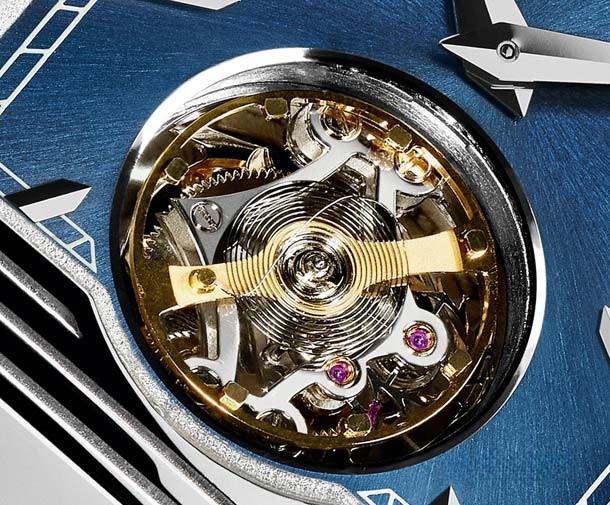Часы Jaeger-LeCoultre Reverso Tribute Tourbillon Duoface представлены в корпусе из платины 950 размером 45.5 х 27.4 х 9.15 мм и водонепроницаемостью до 30 метров. Внутри корпуса установлен механизм с ручным заводом, Калибр 847. На синем циферблате отображаются часы, минуты, секунды, индикатор день/ночь, время второго часового пояса, турбийон. Часы комплектуются ремешком из кожи аллигатора с вставкой из плтины 950. Часы выпущены ограниченной серией 50 шт.