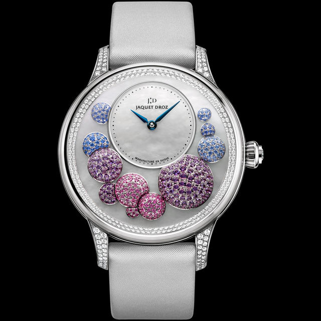 Часы Jaquet Droz Elegance Paris Heure Celeste J005024538 обладают круглым корпусом из 18-каратного белого золота, диаметром 41 мм, водонепроницаемостью до 30 м. Корпус инкрустирован белыми бриллиантами. Рифленая заводная головка расположена на отметке 3 часа. Сапфировое стекло установлено на передней стороне часового корпуса (с антибликовым покрытием) и на его завинчивающейся задней крышке. Циферблат жемчужный, белого цвета, инкрустирован белыми бриллиантами, голубыми и розовыми сапфирами, розовыми аметистами, со стрелками синего цвета. Модель оснащена мануфактурным швейцарским автоматическим механизмом. Калибр с 68-часовым запасом хода и с функциями индикации часов и минут. Калибр отменно отделан и декорирован. Поставляется на ремешке из атласа с вставкой из 18-каратного белого золота.