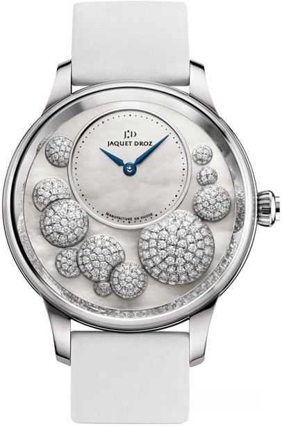 Часы Jaquet Droz Elegance Paris Heure Celeste J005024534 обладают круглым корпусом из 18-каратного белого золота, диаметром 41 мм, водонепроницаемостью до 30 м. Рифленая заводная головка расположена на отметке 3 часа. Сапфировое стекло установлено на передней стороне часового корпуса (с антибликовым покрытием) и на его завинчивающейся задней крышке. Циферблат жемчужный, белого цвета, инкрустирован белыми бриллиантами. Модель оснащена мануфактурным швейцарским автоматическим механизмом. Калибр с 68-часовым запасом хода и с функциями индикации часов и минут. Калибр отменно отделан и декорирован. Поставляется на ремешке из атласа с вставкой из 18-каратного белого золота.