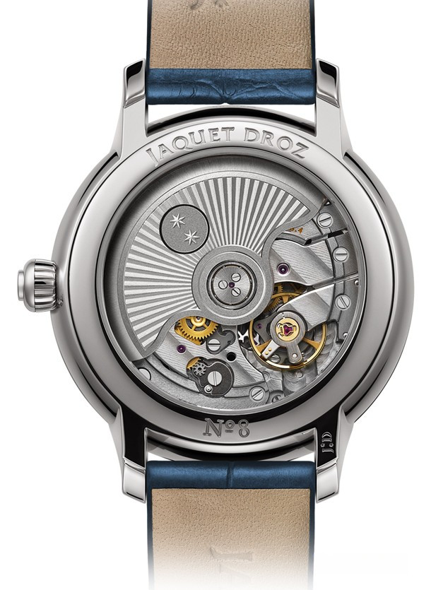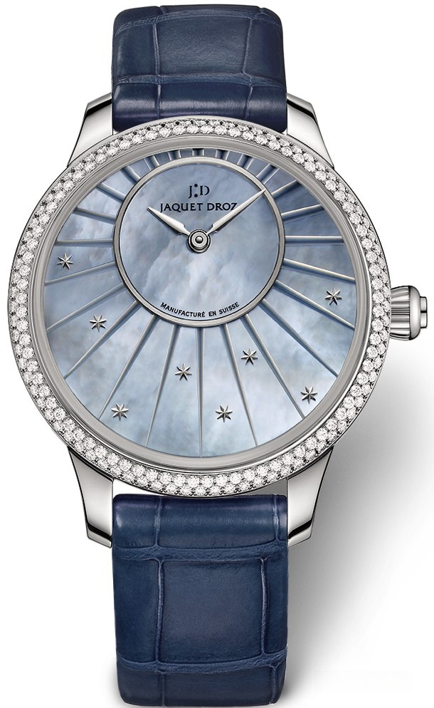 В часах Petite Heure Minute 35 mm воплотилось виртуозное мастерство специалистов Дома. Уникальные циферблаты моделей, выполненные из перламутра или минералов, переливаются красочными цветами при каждом движении руки. Восемь звезд – любимый символ и счастливая цифра Jaquet Droz – озаряют своим сиянием модель с безелем из 160 бриллиантов и циферблатом из перламутра нежно-голубого оттенка, напоминающего небо на рассвете. Корпус часов диаметром 35 мм изготовлен из нержавеющей стали. Внутри корпуса установлен автоматический Калибр Jaquet Droz 2653 с запасом хода 68 часов. Часы комплектуются синим ремешком из кожи аллигатора с вставкой из нержавеющей стали.