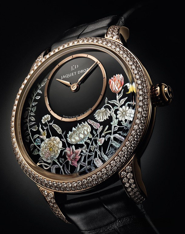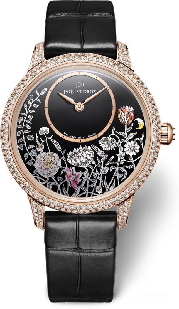 Часы Petite Heure Minute Thousand Year Lights воспевают традиционное мастерство Jaquet Droz, которое насчитывает вот уже почти 300 лет. Они представляют собой подлинный шедевр декоративного искусства, посвященный красоте цветов и женщин, для которых они предназначены.Мастера Jaquet Droz, создавшие Petite Heure Minute со смещенным к отметке «12 часов» циферблатом, воскресили стиль Пьера Жаке-Дро, отразивший духовное богатство эпохи Просвещения. Для оформления циферблата этой изумительной версии Petite Heure Minute мастера часового Дома Jaquet Droz выбрали традиционное искусство Азии. Переливающийся цветочный узор вдохновлен техникой «наджон чхильги», которая представляет собой инкрустацию перламутром с лакировкой. Часы Petite Heure Minute Thousand Year Lights диаметром 35 мм привлекают внимание эффектным циферблатом, на котором изображен букет полевых цветов. Часы выпущены в корпусе из розового золота 18к в количестве 28 штук. Корпус инкрустирован белыми бриллиантами.