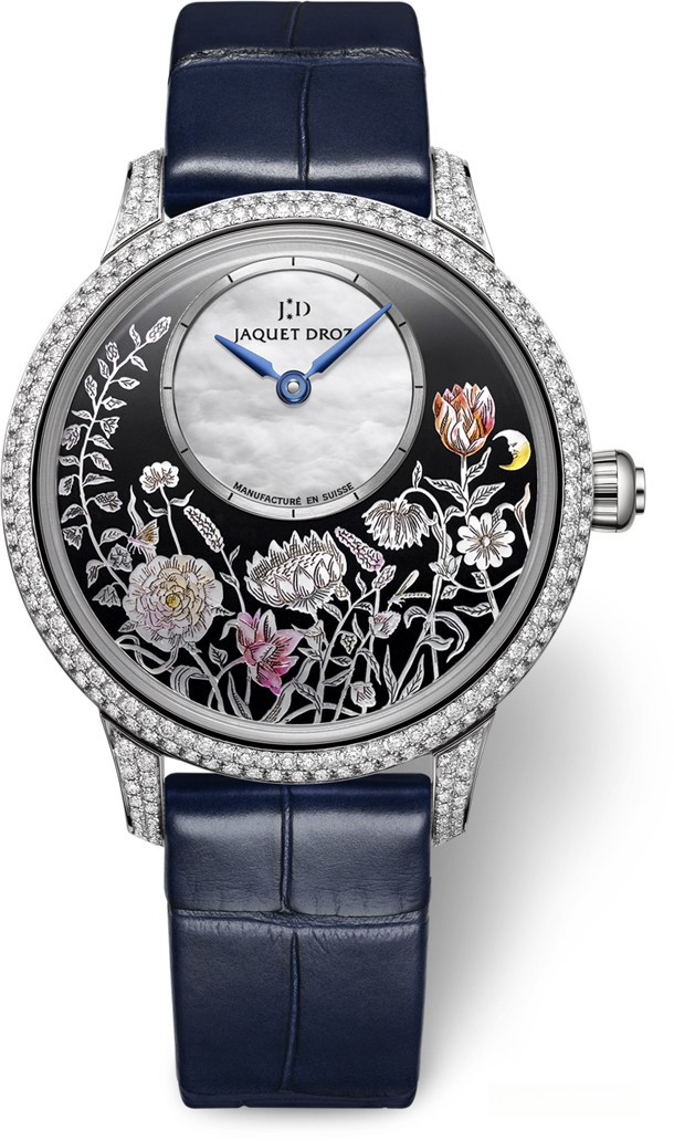 Часы Petite Heure Minute Thousand Year Lights воспевают традиционное мастерство Jaquet Droz, которое насчитывает вот уже почти 300 лет. Они представляют собой подлинный шедевр декоративного искусства, посвященный красоте цветов и женщин, для которых они предназначены. Мастера Jaquet Droz, создавшие Petite Heure Minute со смещенным к отметке «12 часов» циферблатом, воскресили стиль Пьера Жаке-Дро, отразивший духовное богатство эпохи Просвещения. Для оформления циферблата этой изумительной версии Petite Heure Minute мастера часового Дома Jaquet Droz выбрали традиционное искусство Азии. Переливающийся цветочный узор вдохновлен техникой «наджон чхильги», которая представляет собой инкрустацию перламутром с лакировкой. Часы Petite Heure Minute Thousand Year Lights диаметром 35 мм привлекают внимание эффектным циферблатом, на котором изображен букет полевых цветов. Часы выпущены в корпусе из белого золота 18к в количестве 28 штук. Корпус инкрустирован белыми бриллиантами.
