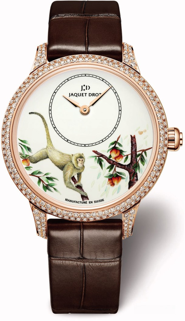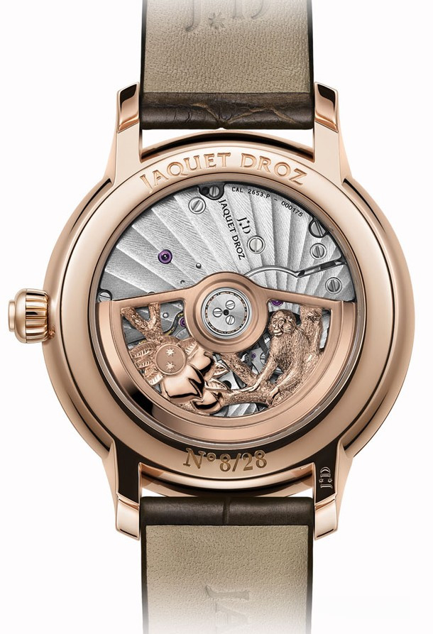 Циферблат цвета слоновой кости выполнен в технике горячей эмали и оформлен миниатюрной росписью. Корпус из розового золота 750 пробы инкрустирован 232 бриллиантами (1,22 карата). Механизм с автоматическим подзаводом. Запас хода 68 часов. Диаметр 35 мм. Ограниченная серия из 28 экземпляров. Jaquet Droz 2653.P, механизм с автоматическим подзаводом, спираль и ушки анкера из кремния, двойной барабан, плоские мосты, ротор из розового золота 916 пробы с выгравированным вручную изображением обезьяны.