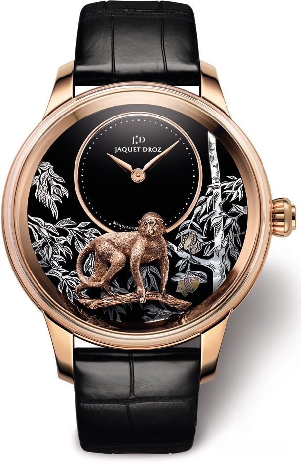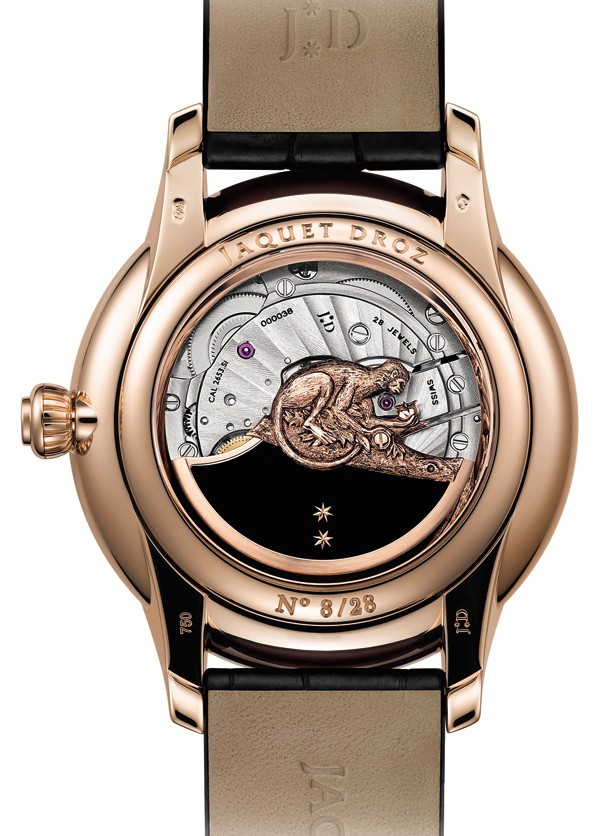 Циферблат из розового золота 750 пробы с отделкой из черного лака и белого перламутра, ручная гравировка и патина, накладное изображение обезьяны из розового золота 750 пробы с ручной гравировкой и патиной, счетчик часов и минут из оникса. Корпус из розового золота 750 пробы. Механизм с автоматическим подзаводом. Запас хода 68 часов. Диаметр 41 мм. Ограниченная серия из 28 экземпляров. Jaquet Droz 2653.Si, механизм с автоматическим подзаводом, спираль и ушки анкера из кремния, двойной барабан, ротор из розового золота 750 пробы и оникса с накладным изображением обезьяны из розового золота 916 пробы.