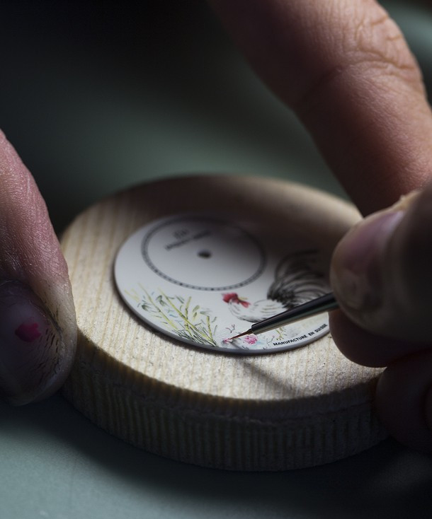Циферблат цвета слоновой кости выполнен в технике горячей эмали и оформлен миниатюрной росписью. Корпус из розового золота 750 пробы. Механизм с автоматическим подзаводом Jaquet Droz 2653.P. Запас хода 68 часов. Диаметр 39 мм. Ограниченная серия из 28 экземпляров.