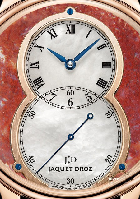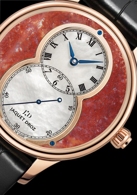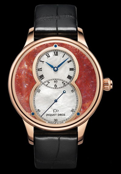 Часы Jaquet Droz Legend Geneva Grande Seconde Circled Lady Grande Seconde Circled Red Agate обладают круглым корпусом из 18-каратного розового золота, диаметром 39 мм, водонепроницаемостью до 30 м. Рифленая заводная головка расположена на отметке 3 часа. Сапфировое стекло установлено на передней стороне часового корпуса (с антибликовым покрытием) и на его завинчивающейся задней крышке. Циферблат жемчужный, белого цвета из красного мохового агата, инкрустирован белыми бриллиантами, со стрелками синего и черного цвета. Модель оснащена мануфактурным швейцарским автоматическим механизмом. Калибр с 68-часовым запасом хода и с функциями индикации часов, минут и секунд. Калибр отменно отделан и декорирован. Поставляется на ремешке из кожи с вставкой из 18-каратного розового золота. Модель выпускается ограниченной серией в количестве 88 экземпляров.