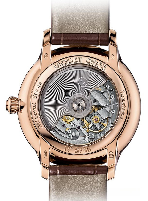 Часы Grande Seconde Circled Sunstone представлены в корпусе из розового золота 18к диаметром 39 мм и водонепроницаемостью до 30 метров. Автоматический механизм поддерживает функционал часов, минут и секунд, которые отображаются на белом жемчужном циферблате при помощи мечевидных стрелок. Часы комплектуются коричневым ремешком из кожи аллигатора с вставкой из розового золота 18к. На циферблате золотые крупинки мерцают и излучают свечение завораживающей интенсивности, напоминая нам о мощности светового потока звезды, которую в древности мудрецы считали одновременно небесным телом и божеством. Sunstone является последним дополнением, выдержанным в рамках давней почитаемой брендом традиции разработки циферблата из минералов яшмы, лазурита или метеорита. Серия выпущена в количестве 88 экземпляров.