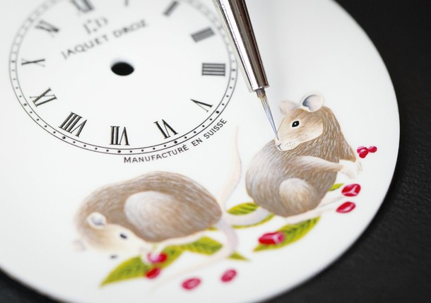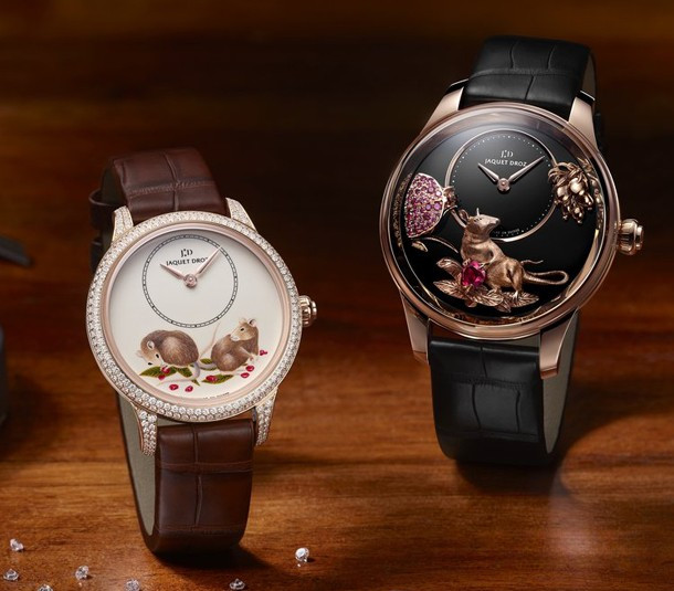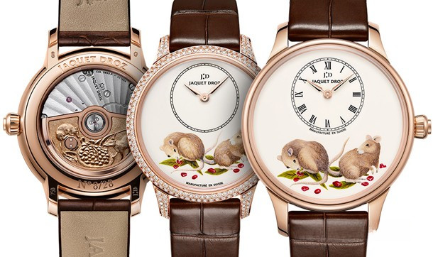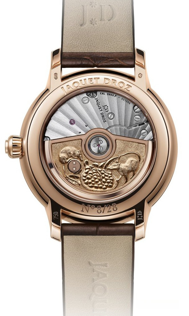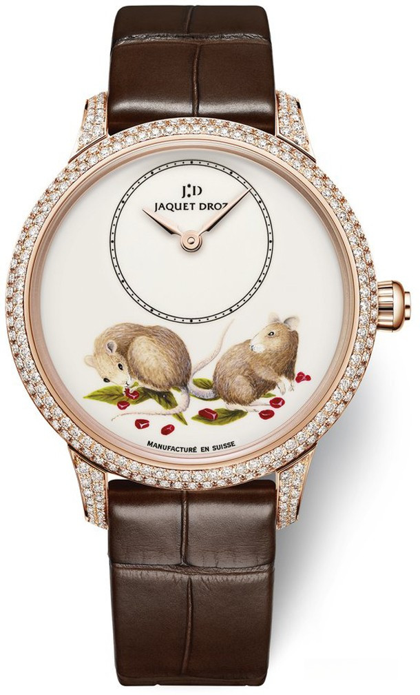Часы Jaquet Droz Petite Heure Minute Rat представлены в корпусе из розового золота 18к размером 35 х 10.75 мм водонепроницаемостью 30 метров. Циферблат цвета слоновой кости выполнен в технике горячей эмали с художественной миниатюрой. Механизм с автоматическим подзаводом, Калибр Jaquet Droz 2653.P. Запас хода 68 часов. Ограниченная серия из 28 экземпляров. Часы поставляются на ремешке из кожи аллигатора с вставкой из розового золота 18к. Корпус инкрустирован белыми бриллиантами.