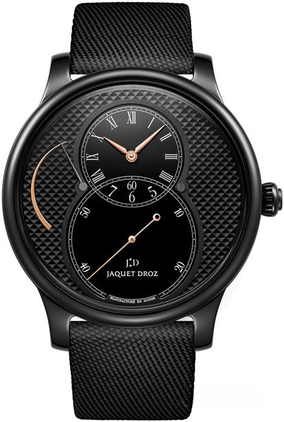 Часы Jaquet Droz Legend Geneva Grande Seconde Power Reserve J027035541 круглым корпусом из керамики, диаметром 44 мм, водонепроницаемостью до 30 м. Рифленая заводная головка расположена на отметке 3 часа. Сапфировое стекло установлено на передней стороне часового корпуса (с антибликовым покрытием) и на его завинчивающейся задней крышке. Циферблат черного цвета с мотивом Clous de Paris. Модель оснащена мануфактурным швейцарским автоматическим механизмом, с 68-часовым запасом хода, функциями индикации часов, минут и секунд. Калибр отменно отделан и декорирован. Поставляется на текстильном ремешке с вставкой из нержавеющей стали. Модель выпускается ограниченной серией в количестве 28 экземпляров.