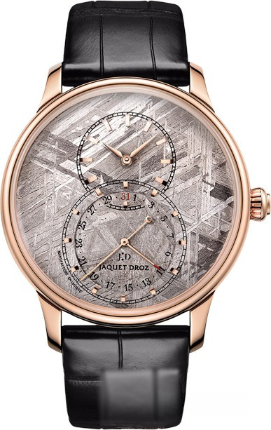 Часы Jaquet Droz Grande Seconde Quantieme представлены в корпусе из розового золота 18к диаметром 43 мм и водонепроницаемостью 30 метров. На циферблате из серого метеорита отображаются часы, минуты, секунды, дата. Внутри корпуса установлен автоматический Калибр Jaquet Droz с запасом хода 68 часов. Часы поставляются на ремешке из кожи аллигатора с вставкой из розового золота 18к. Серия ограничена - 88 шт.