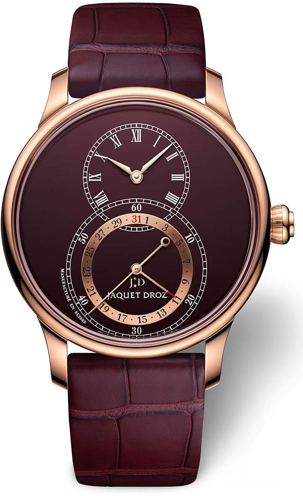 Часы Jaquet Droz Grande Seconde Quantieme 41 mm представлены в корпусе из розового золота 18к размером 41 х 12.1 мм водонепроницаемостью 30 метров. На бордовом циферблате отображаются часы, минуты, секунды, дата. Внутри корпуса находится автоматический механизм, Калибр Jaquet Droz 2660Q2, обладающий запасом хода 68 часов. Часы поставляются на ремешке из кожи аллигатора с вставкой из розового золота 18к.