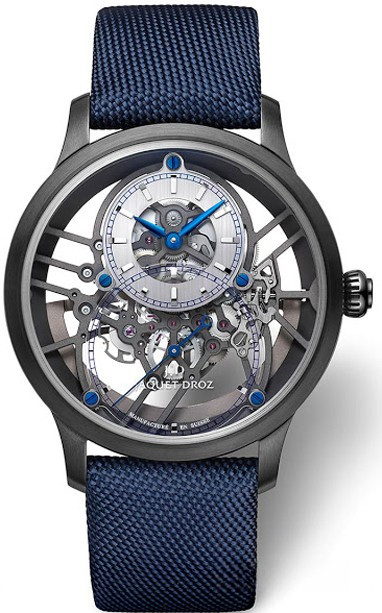 Часы Jaquet Droz Grande Seconde Skelet-One представлены в корпусе из керамики размером 41.5 х 12.48 мм и водонепроницаемостью до 30 метров. Внутри корпуса установлен автоматический механизм, Калибр Jaquet Droz 2663 SQ с запасом хода 68 часов. На сером скелетированном циферблате отображаются часы, минуты, секунды. Часы комплектуются текстильным ремешком с вставкой из нержавеющей стали.