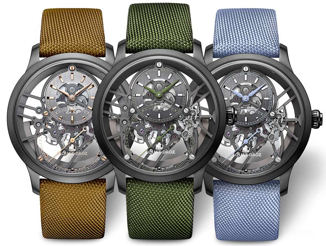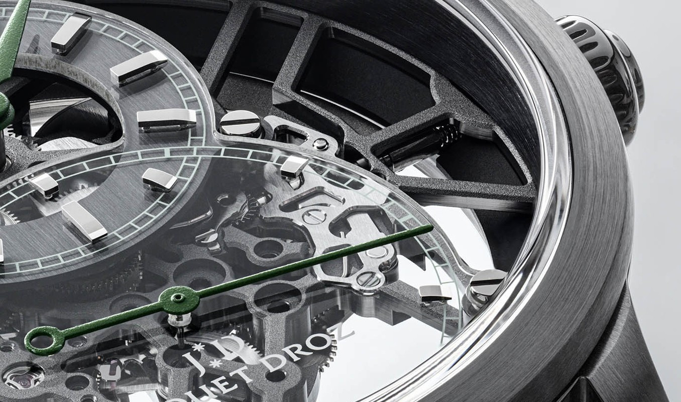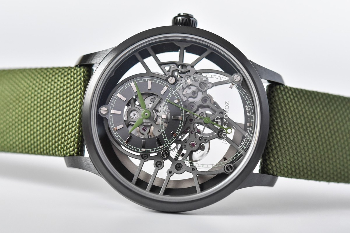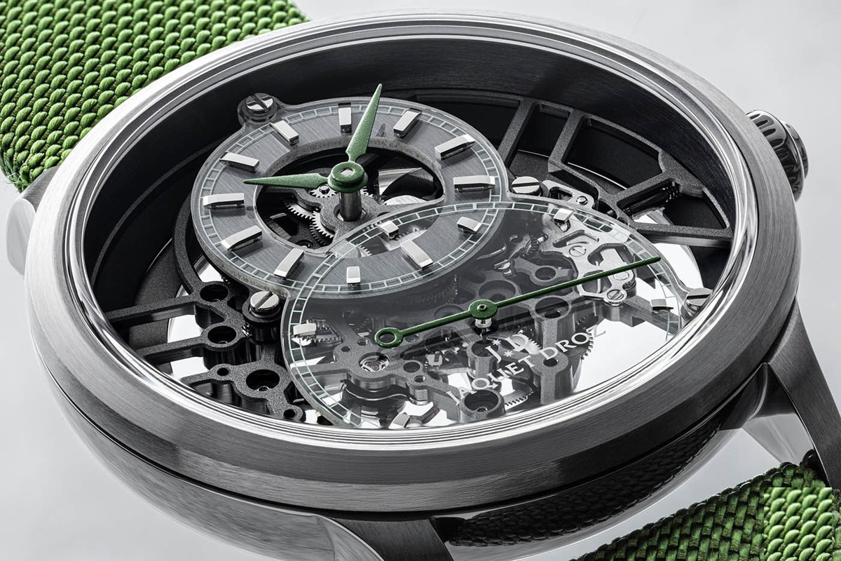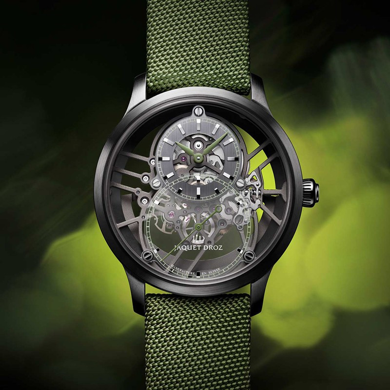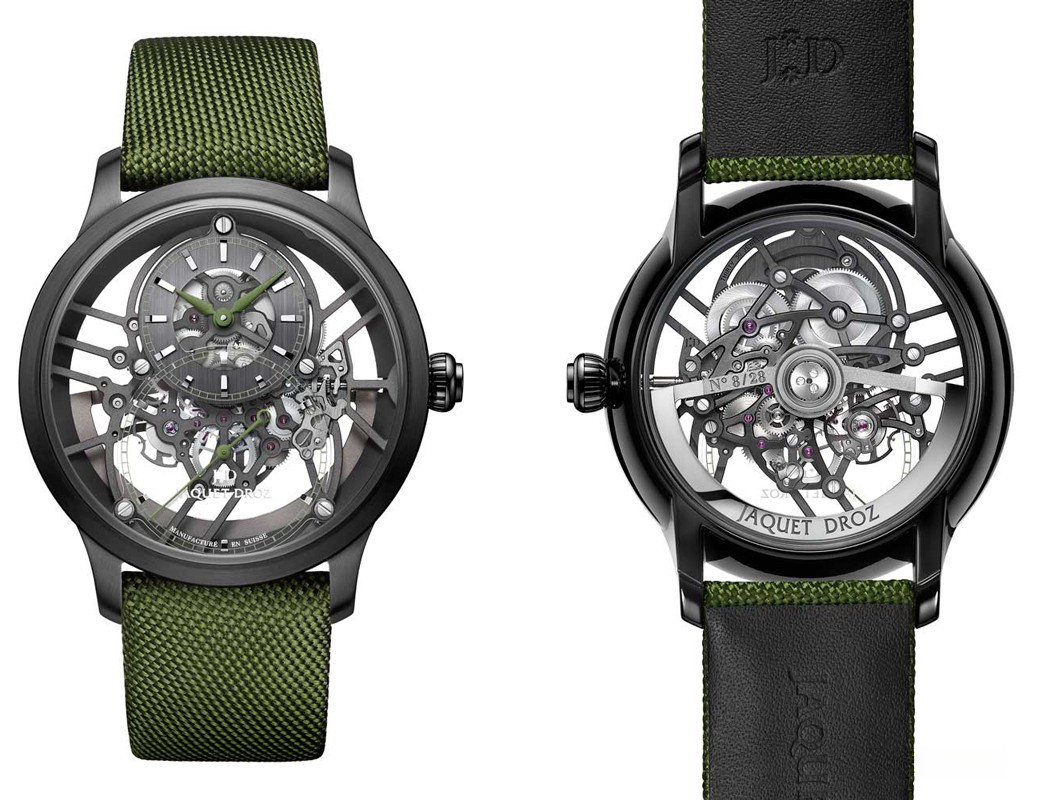 Часы Jaquet Droz Grande Seconde Skelet-One представлены в корпусе из керамики размером 41.5 х 12.48 мм и водонепроницаемостью до 30 метров. Внутри корпуса установлен автоматический механизм, Калибр Jaquet Droz 2663 SQ с запасом хода 68 часов. На сером скелетированном циферблате отображаются часы, минуты, секунды. Часы комплектуются текстильным ремешком с вставкой из нержавеющей стали. Серия ограничена - 28 шт.