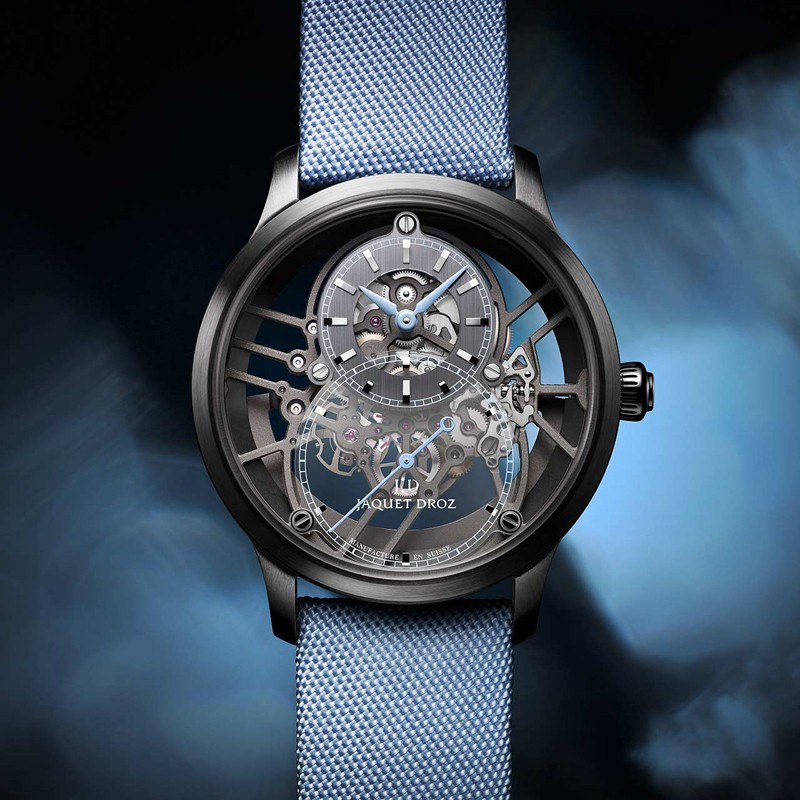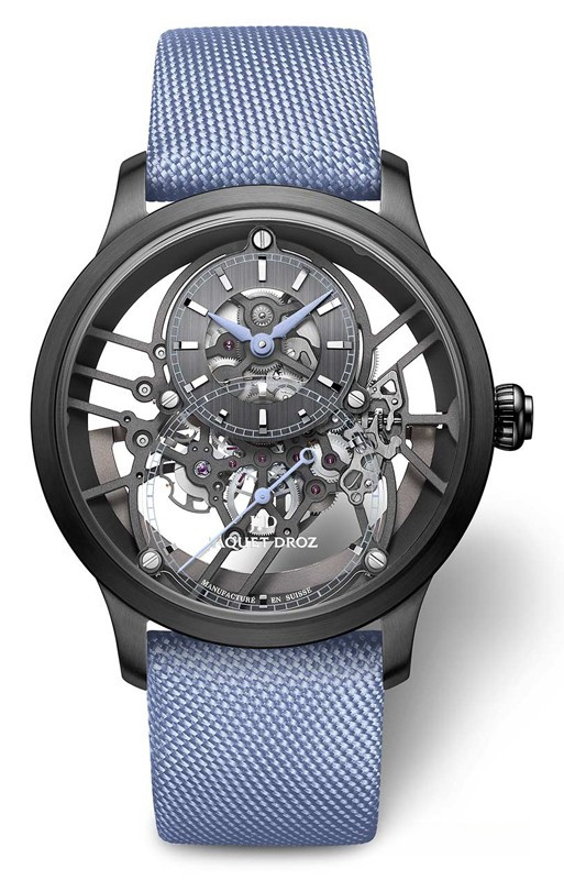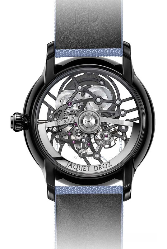 Часы Jaquet Droz Grande Seconde Skelet-One представлены в корпусе из керамики размером 41.5 х 12.48 мм и водонепроницаемостью до 30 метров. Внутри корпуса установлен автоматический механизм, Калибр Jaquet Droz 2663 SQ с запасом хода 68 часов. На сером скелетированном циферблате отображаются часы, минуты, секунды. Часы комплектуются текстильным ремешком с вставкой из нержавеющей стали. Серия ограничена - 28 шт.